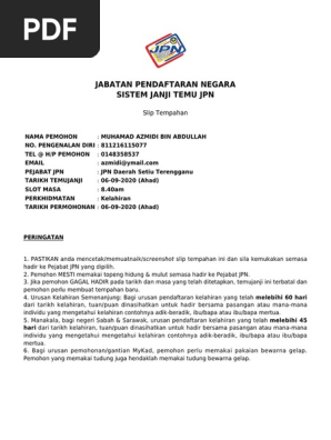 Pengguna hendaklah memilih tarikh dan slot masa mengikut waktu operasi / bekerja rasmi berdasarkan lokasi pilihan kerana terdapat perbezaan waktu kaunter bagi sesetengah cawangan jabatan pendaftaran negara (rujuk portal jpn bagi maklumat operasi pejabat )