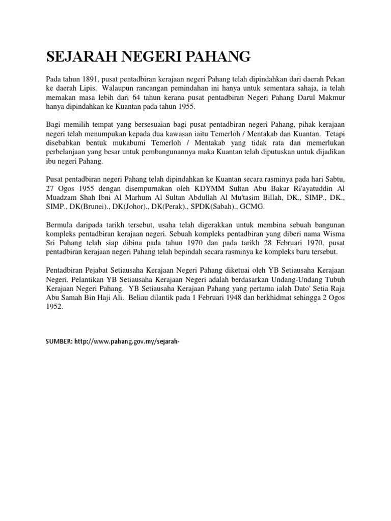Malaysia One Education from oneeducations.com Pengisytiharan ini dimulakan dengan upacara perbarisan khas di padang besar kuantan. Masjid negeri ini telah di bina pada tahun 1888 oleh seorang saudagar arab yaman yang bernama habib hasan. Kuala lipis dahulunya pusat perlombongan emas sebelum british tiba pada 1887. Kuala lipis terletak dipertemuan sungai jelai dengan sungai lipis dan merupakan ibu negeri pahang yang pertama mulai tahun 1898 sebelum dipindahkan ke kuantan pada tahun 1955. Ia juga boleh dikatakan menjadi penempatan terawal di pahang. Terdapat sebuah bilik yang pernah menempatkan sir hugh clifford menjalankan tugas sebagai pentadbir daerah lipis. Kereta sewa velfire kuantan pahang. Meskipun pada zaman penjajahan ketika j.